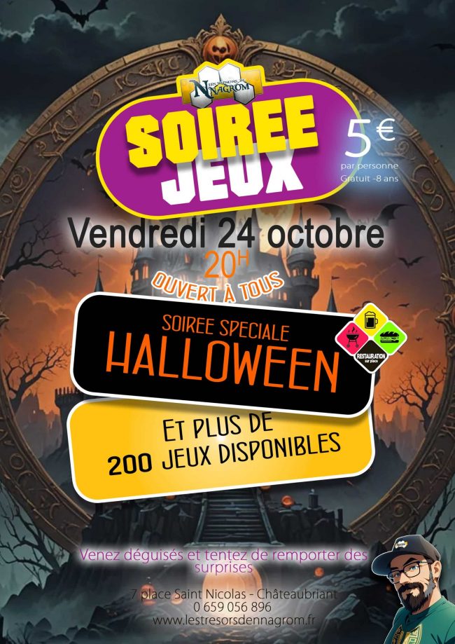 SOIREE JEUX Vendredi 24 octobre 2025 à partir de 20h Venez découvrir les jeux de la boutique ainsi que les nouveautés dans une ambiance Halloween. Venez déguisez et tentez de remporter des lots pour votre originalité… La soirée d’Halloween de la boutique proposera des Quiz, des défis et une bonne ambiance garantie. Réservation conseillée 5€…