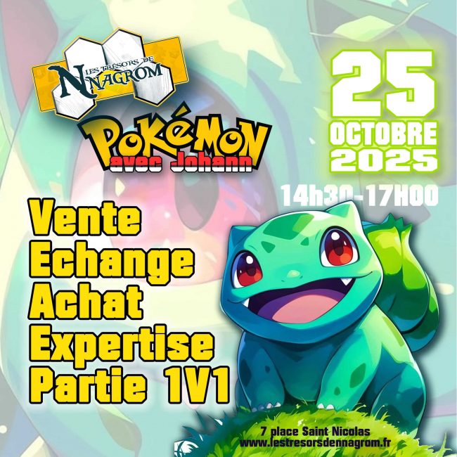 Samedi 25 octobre 2025 14H30-17H Après midi Pokémon, Johann, revient pour un après midi sous le signe des Pokémon. Partie en 1V1, échange, expertise de cartes. Venez découvrir ou augmenter votre expérience des Pokémon.