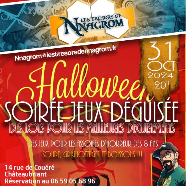 Jeudi 31 octobre 2024 à partir de 20H Pour célébrer Halloween, venez déguisés pour une soirée riche en frissons autour de jeux de société. Lots pour les meilleurs déguisements réservation préférable 6,66€ par personne à partir de 8 ans