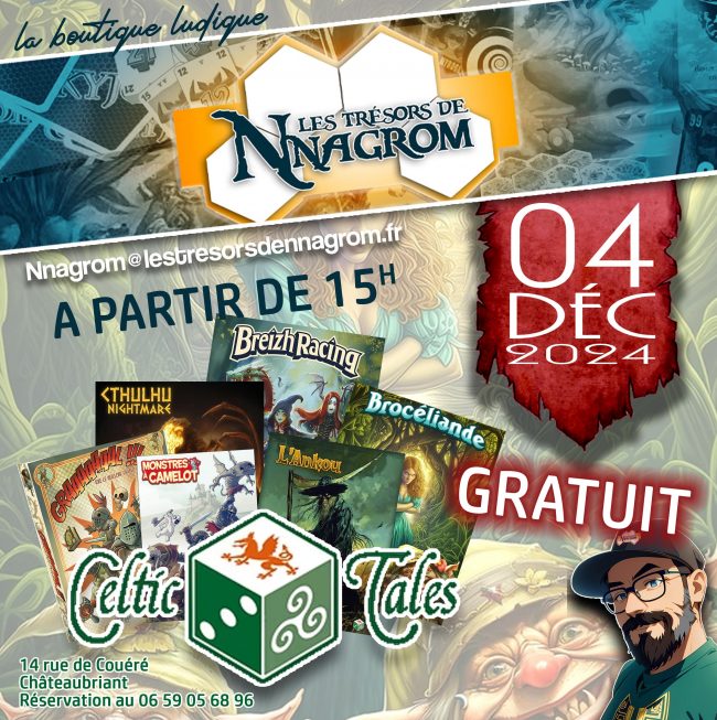 [CHATEAUBRIANT] Mercredi 4 décembre à partir de 15h. A l’occasion de notre nouveau partenariat, nous vous proposons un après midi découverte en présence d’Alexandre de Celtic Tales. Jeu de cartes, jeu de plateau, à deux joueurs ou jusqu’à 8, venez découvrir l’univers breton de Celtic Tales dont les jeux ont pour point commun; la légende…