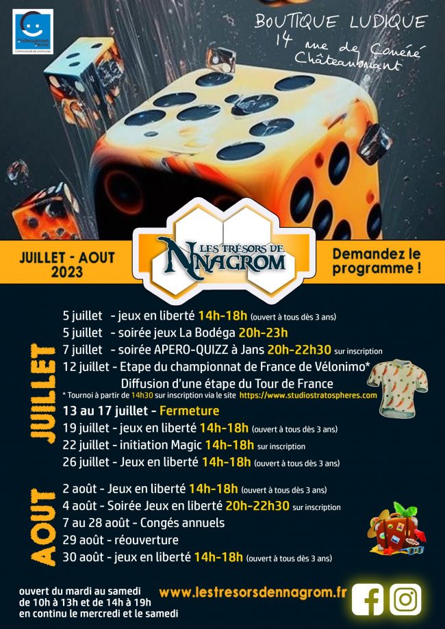 Retrouvez ici la programmation du mois de juillet et du mois d’août 2023. Il y en a pour tous les niveaux, tous les âges et toute la famille… Inscris toi au championnat de France du Jeu « Velonimo » de Bruno Cathala. Le jeu officiel du Tour de France fait étape à la boutique le MERCREDI 12…