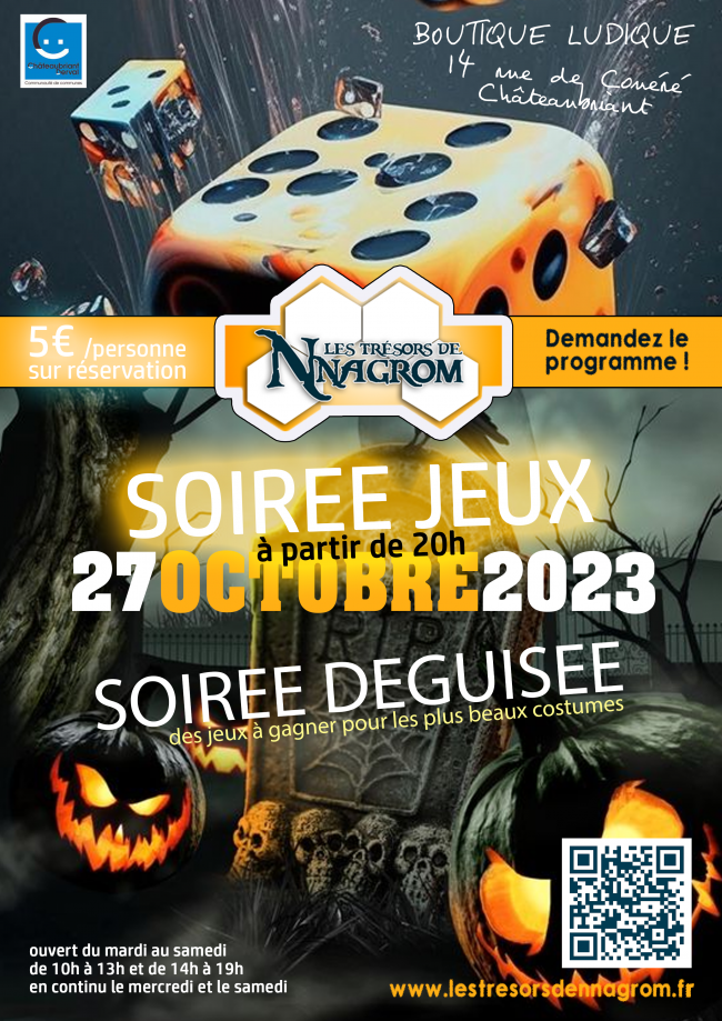 SOIREE JEUX Vendredi 24 octobre 2025 à partir de 20h Venez découvrir les jeux de la boutique ainsi que les nouveautés dans une ambiance Halloween. Venez déguisez et tentez de remporter des lots pour votre originalité… La soirée d’Halloween de la boutique proposera des Quiz, des défis et une bonne ambiance garantie. Réservation conseillée 5€…