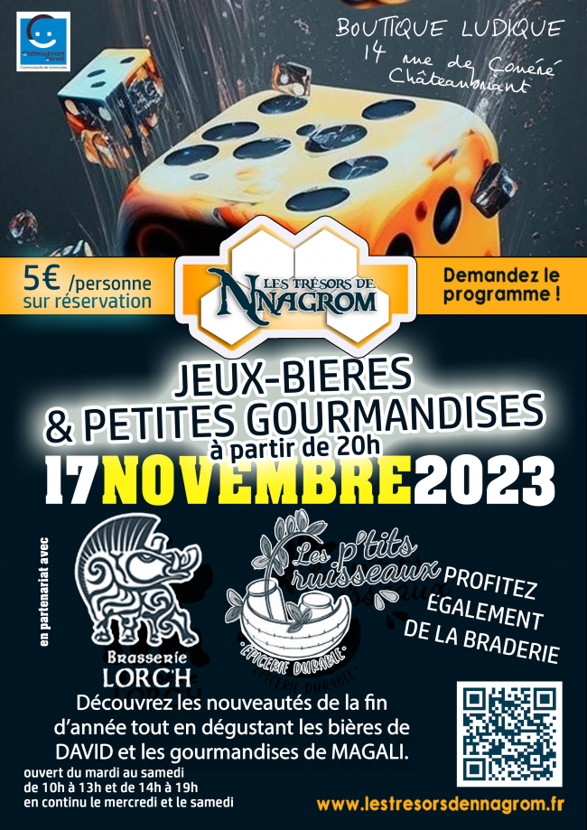 17 NOVEMBRE 2023 dès 20H 5€ sur inscription En partenariat avec Les P’tits Ruisseaux (Epicerie durable) et La Brasserie de LORC’H, nous vous proposons une soirée où vous pourrez déguster de la bière, des gourmandises et des jeux. Profitez également de la braderie pour vos premiers achats de Noel !!!