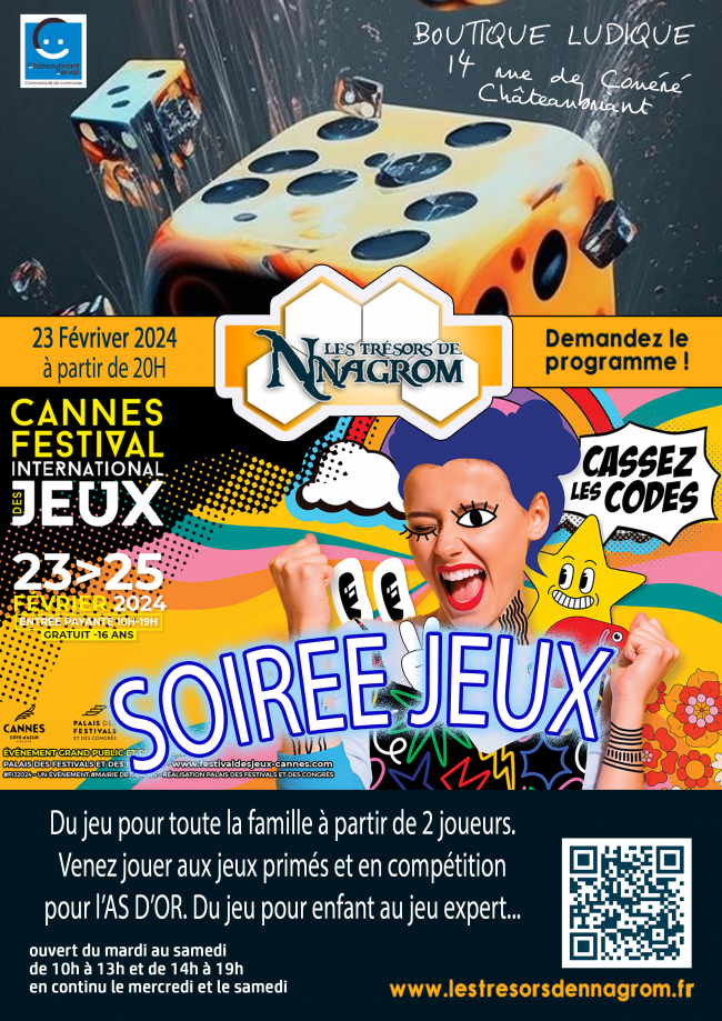 Vendredi 23 février 2024 à partir de 20H Sur inscription 5€ par personne A l’occasion du festival de Cannes, venez découvrir ou redécouvrir les jeux nominés ou primés au Festival International du Jeu de Cannes. -Flamme Rouge -District Noir -Faraway -Akropolis -Sur Les Traces de Darwin -Trio -Perfect Words et bien d’autres…