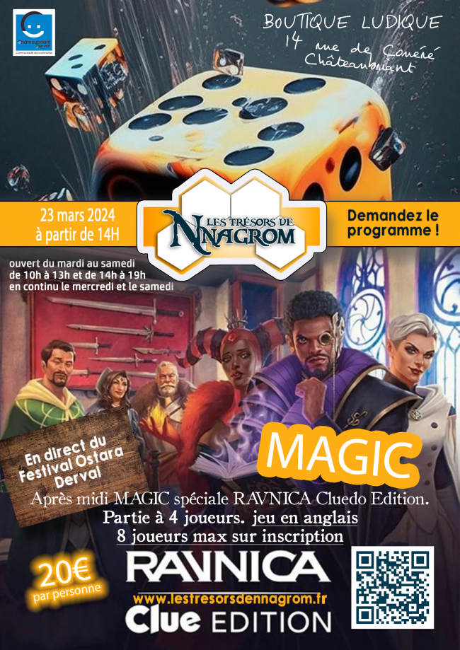 Samedi 23 mars à partir de 14h En direct du Festival Ostara à Derval, venez participer à des parties MAGIC RAVNICA CLUE EDITION. 20€ par personne sur réservation. 8 joueurs maximum.