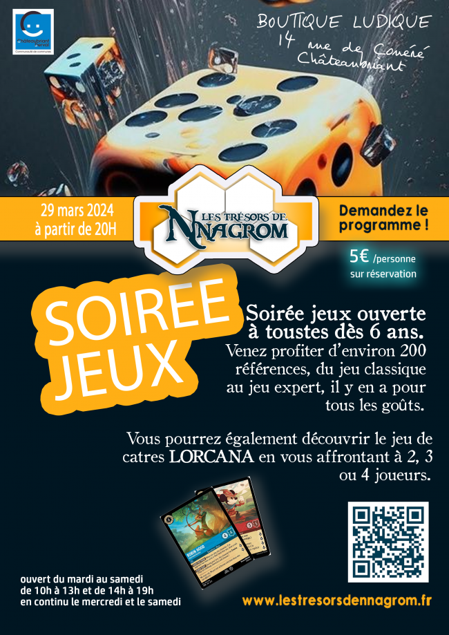 Le 21 avril 2023 de 19h à 21h30 au Trésors de Nnagrom, à Châteaubriant. Viens découvrir des jeux qui ne sont pas encore sortis ou en développement ! 5€/personnes – sur inscription