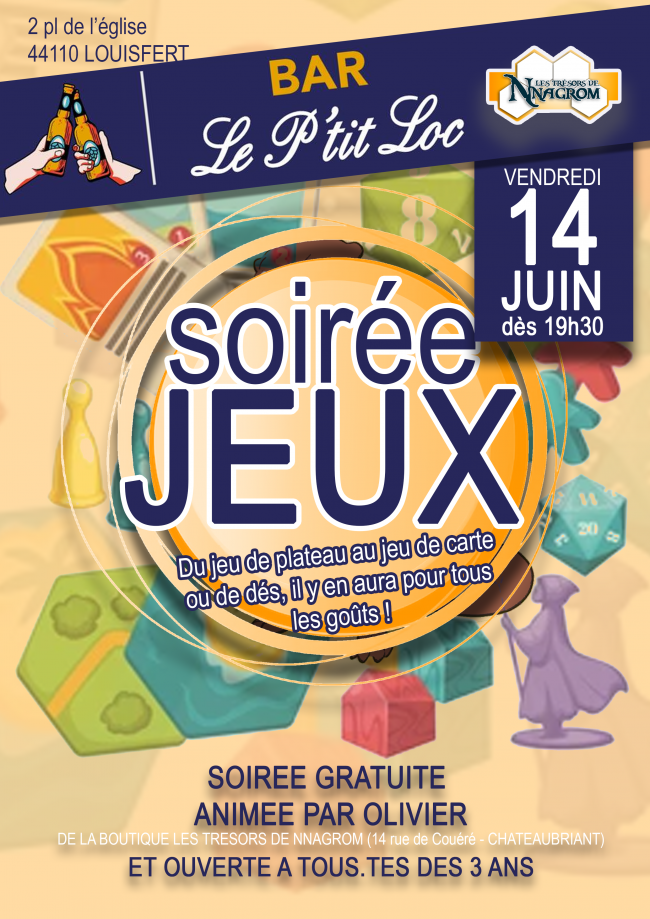 Vendredi 14 juin 2024 à partir de 19h30 Retrouvez la boutique pour une soirée esceptionnelle au bar LE P’TIT LOC en face de l’église de Louisfert. Pour cette soirée, venez découvrir les nouveautés du moment mais aussi quelques classique comme le Skyjo, le 6 qui prends pour des parties en famille ou entre amis. L’entrée…