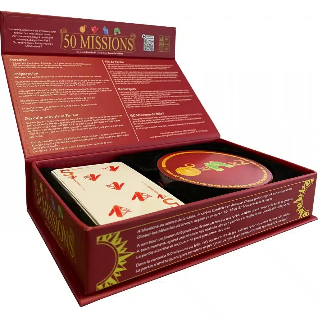 Un classique moderne, habillé à la manière d’un classique du 19è siècle. Avec une règle assez simple pour tenir à l’intérieur du couvercle magnétique, 50 Missions surprend par son accessibilité mais aussi par sa richesse : tous le monde peut y jouer, mais pour réussir les 50 Missions, il faudra peser ensemble chaque décision