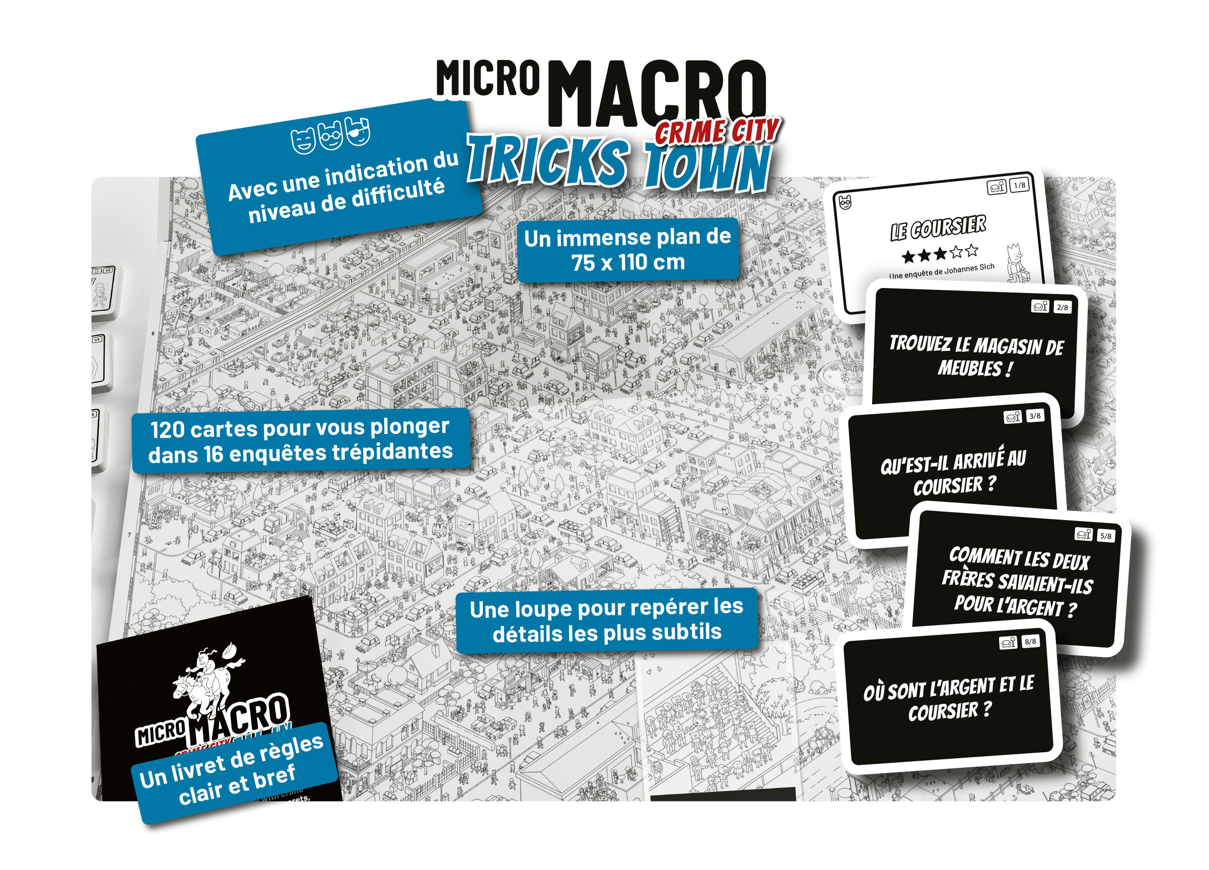 Tricks Town est le troisième volet de la série MicroMacro. Venez y découvrir une nouvelle partie de la ville, avec ses 16 enquêtes inédites et plus corsées à mener. Ce jeu est indépendant des premiers volets : il n‘est pas nécessaire de posséder ou d‘avoir joué aux épisodes précédents pour vous lancer dans ces nouvelles affaires ! MicroMacro est un jeu coopératif. Un œil affûté et un sens de la déduction aiguisé seront vos meilleurs atouts pour coincer les criminels les plus retors ! Les joueurs incarnent des détectives qui devront résoudre des affaires criminelles en observant le plan de la ville. Ils choisissent une enquête et retournent la première carte qui détaille l’affaire. Prenez ensuite la carte suivante et répondez à la question indiquée. Pour vérifier votre affirmation retournez la carte, la réponse est au dos ! Continuez de répondre aux questions afin de résoudre l’enquête.