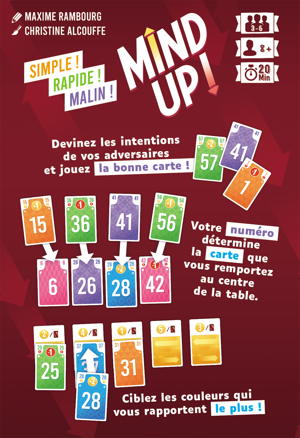 Derrière son immédiateté et sa grande simplicité d’accès, Mind Up! dévoile au fil des parties de nombreuses subtilités : vos capacités à bien utiliser les cartes de votre main et à deviner quelles cartes vos adversaires convoitent feront la différence !